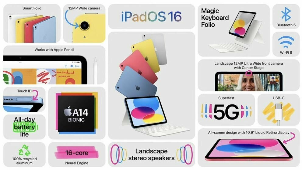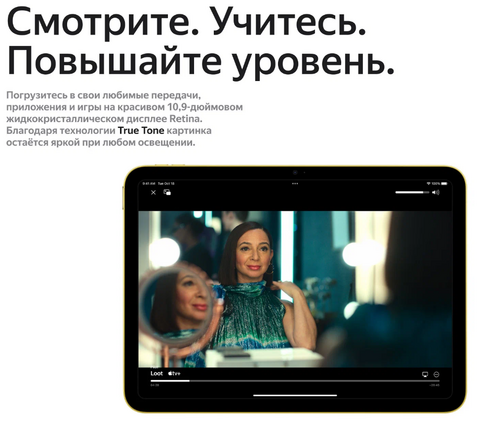 Совершенно новый iPad красочно переосмыслен, чтобы сделать его более функциональным, интуитивно понятным и еще более увлекательным. Благодаря новому полноэкранному дизайну, 10,9‑дюймовому дисплею Liquid Retina и четырем великолепным цветам iPad предоставляет мощный способ делать что-то, творить и ос