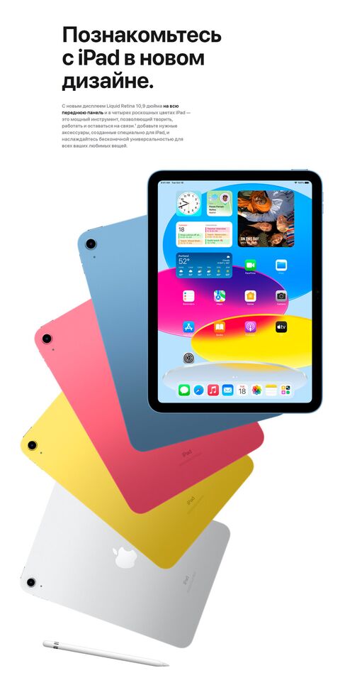 Совершенно новый iPad красочно переосмыслен, чтобы сделать его более функциональным, интуитивно понятным и еще более увлекательным. Благодаря новому полноэкранному дизайну, 10,9‑дюймовому дисплею Liquid Retina и четырем великолепным цветам iPad предоставляет мощный способ делать что-то, творить и ос