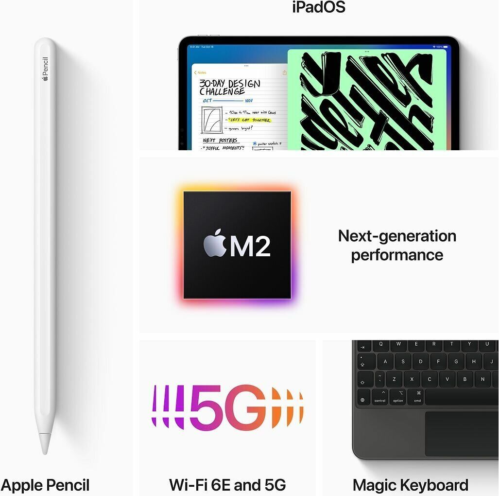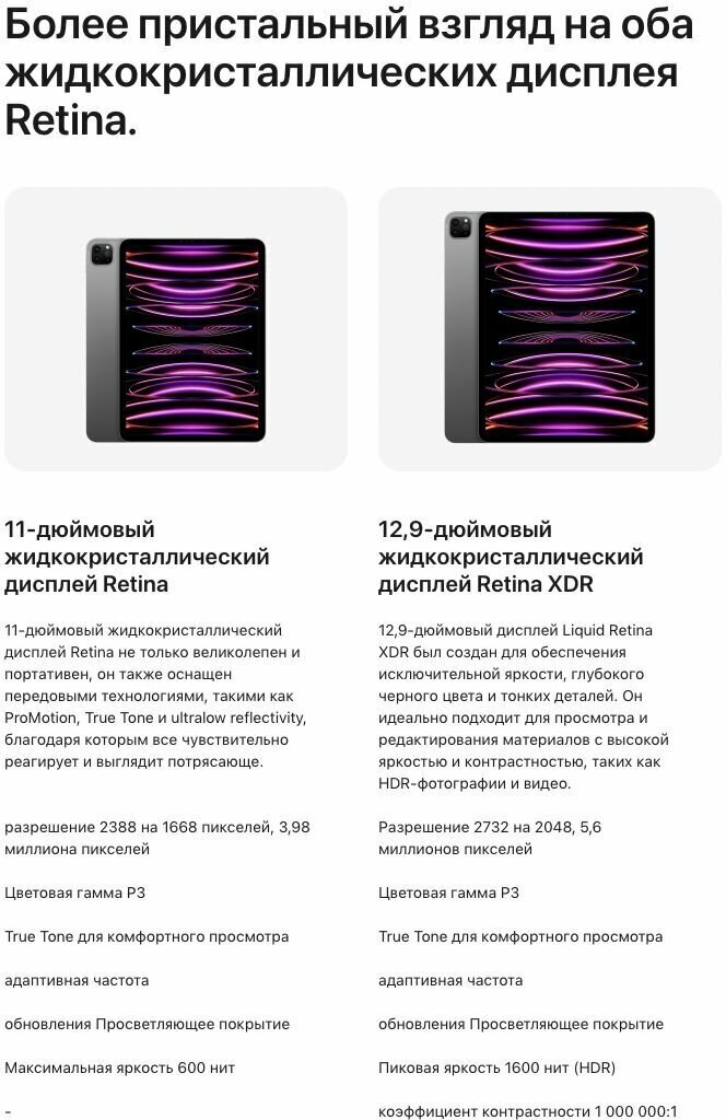 Планшет Apple iPad Pro 11 2022 — модель с рубленными гранями и закругленными углами, выполнена в корпусе из алюминия. 11-дюймовый экран типа Liquid Retina отображает изображение с реалистичной цветопередачей. Разрешение 1668х2388 пикселей дает возможность наслаждаться детализированной графикой. Пред