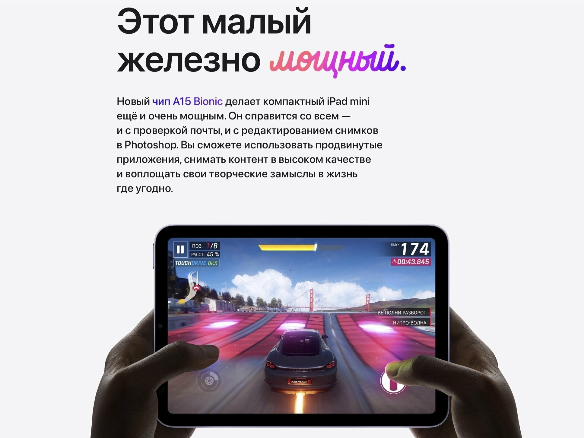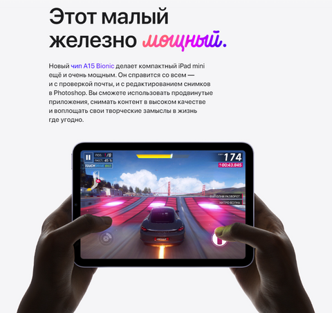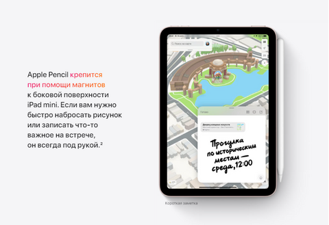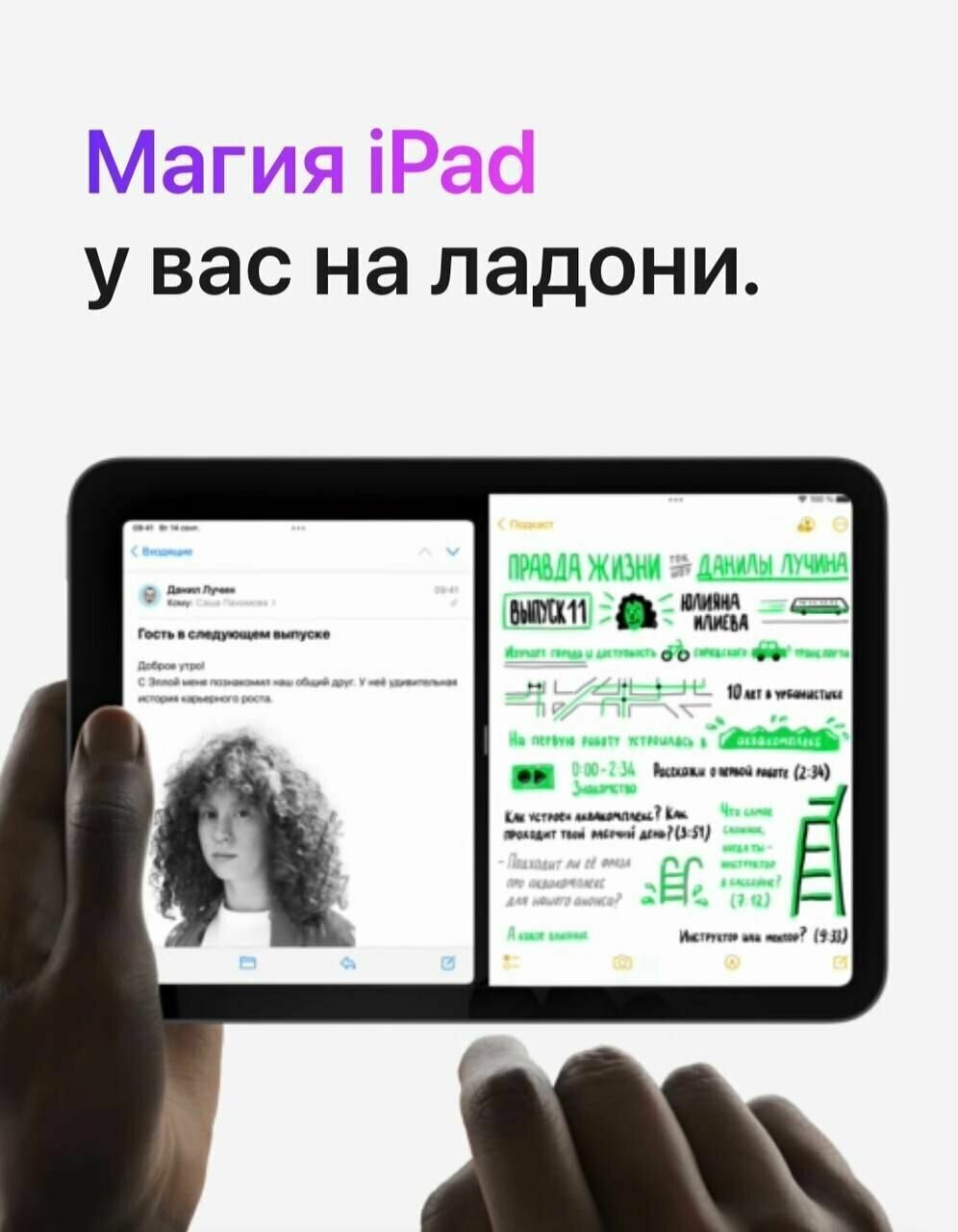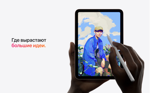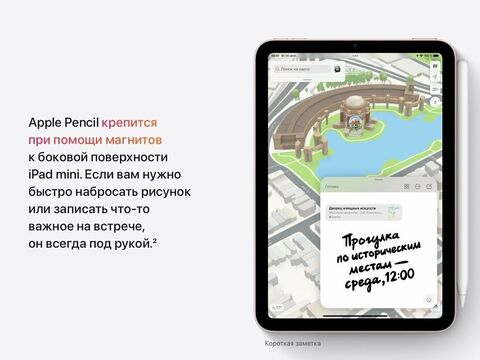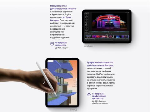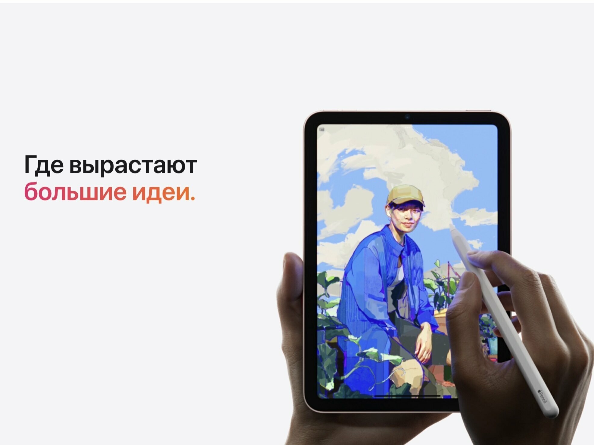 Великолепный дисплей Liquid Retina с диагональю 8,3 дюйма занимает всю переднюю панель. Экран стал больше, но устройство осталось компактным и помещается у вас на ладони. Apple Pencil теперь можно примагнитить к боковой поверхности iPad mini — так он будет всегда под рукой. Новый чип A15 Bionic и ак