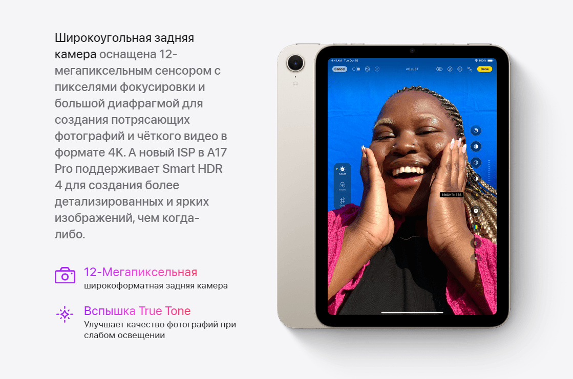 линейка производителя: iPad mini, год начала продаж: 2024, диагональ: 8"-8.9", диагональ экрана: 8.30 ", формат разрешения экрана: Full HD, частота обновления: 60 Гц, количество ядер процессора: 6, тип разъема для зарядки: USB Type-C, количество основных камер: 1, особенности: cканер отпечатка пальц