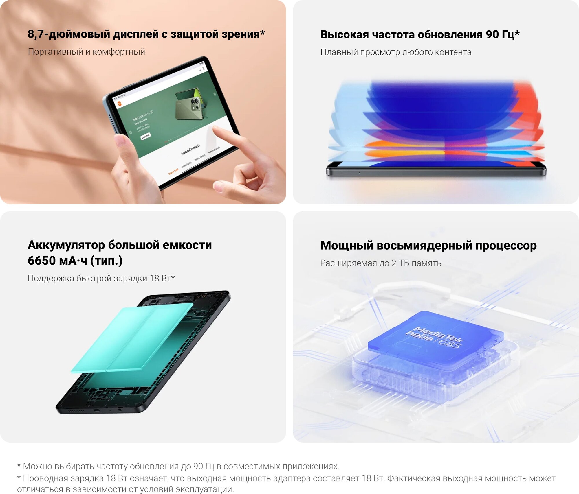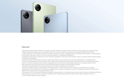 Общие параметры Модель: Redmi Pad SE 8.7 Версия ОС: Android 14 Год релиза: 2024 Материал корпуса: Пластик Цвет: Graphite Gray / Серый Дисплей Диагональ экрана: 8.7" Тип матрицы: IPS Разрешение экрана: 1340 x 800 Плотность пикселей: 179 ppi Частота обновления: 90 Гц Яркость: 500 нит ,600 нит Контраст